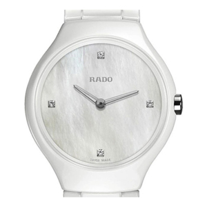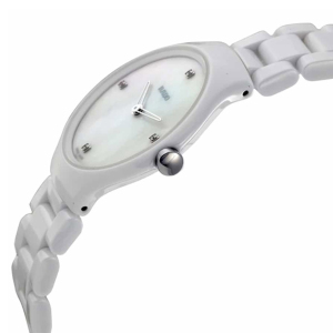 Корпус: Высокотехнологичная керамика. Сапфировое стекло. Диаметр 30 мм, водонепроницаемость 30 метров. Циферблат светлый перламутровый. 4 бриллианта.