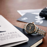 Корпус: Корпус из нержавеющей полированной/матовой стали, безель с PVD - покрытием розового цвета. Серый циферблат украшен тримя бриллиантами. Стрелки и риски золотистого цвета. Сапфировое стекло с антибликовым покрытием. Диаметр 33,8 мм. Водостойкость 200 м.