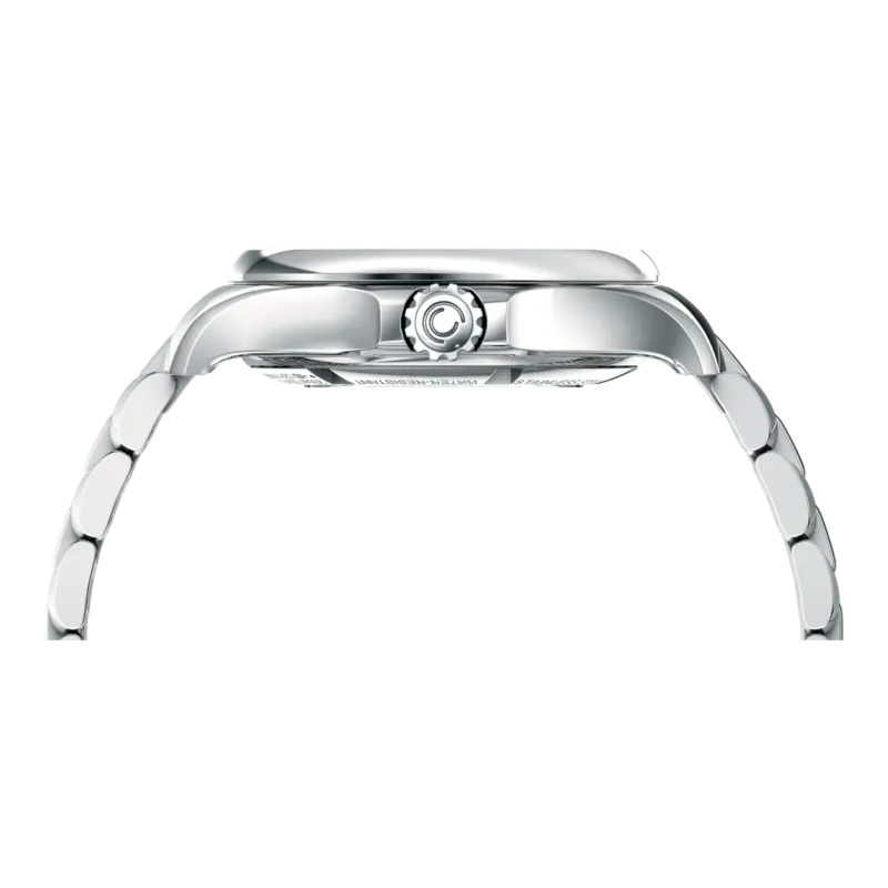Корпус: Корпус модели выполнен из высококачественной стали марки 316L с повышенной устойчивостью к коррозии, поверхности с матовой шлифовкой – сатинированием и полировкой до зеркального блеска. Чёрный циферблат украшен 8 бриллиантами цвета Top Wesselton. Одностороннее антибликовое покрытие сапфирового стекла. Прозрачная задняя крышка. Диаметр: 34,5 мм. Водостойкость: 200 м.
