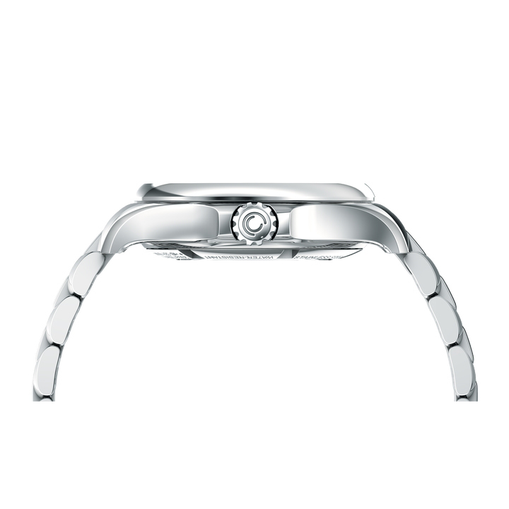 Корпус: Нержавеющая сталь 316L. Белый перламутровый циферблат, декорирован 8 бриллиантами Top Wesselton. Стрелки и часовые индексы золотистого цвета. Сапфировое стекло с односторонним антибликовым покрытием. Диаметр 34,5 мм. Водозащита 200 м.