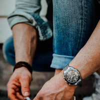 Функции: Индикация часов, минут при помощи центральных стрелок. Маленькая, отдельно вынесенная секундная стрелка. Дата в положении "6 часов". Хронограф.
