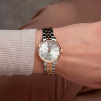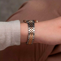 Корпус: Корпус из полированной/матовой нержавеющей стали с частичным PVD - покрытием розового цвета. Металлик циферблат, золотистые стрелки и часовые индексы с люминесцентным покрытием. Сапфировое стекло. Диаметр 28 мм. Водостойкость 100 м.