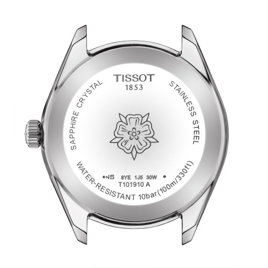 Корпус: Корпус выполнен из высококачественной стали с повышенной устойчивостью к коррозии, поверхности с матовой шлифовкой – сатинированием и полировкой до зеркального блеска. Безель имеет 6 выступов. Светло-голубой циферблат с логотипом Tissot. Стрелки и часовые индексы покрыты люминесцентным составом SuperLuminova. Сапфировое стекло с антибликовым покрытием, устойчивое к появлению царапин, обладающее высокой прозрачностью. На задней крышке выгравирован цветок с семейного герба Tissot. Диаметр корпуса составляет 36 мм. Водонепроницаемость: 100 м.