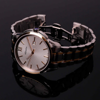 Корпус: Круглый корпус выполнен из полированной нержавеющей стали с частичным PVD покрытием желтого золота. Серебристый циферблат с узором гильоше. Метки в виде штрихов и римской цифры 12. Стрелки с покрытием SuperLuminova, которое обеспечивает длительную подсветку в темное время суток. Устойчивое к возникновению царапин сапфировое стекло. Заводная головка с защитой. Диаметр корпуса составляет 45 мм, толщина 9 мм. Водостойкость WR 50 (мытье рук, дождь).