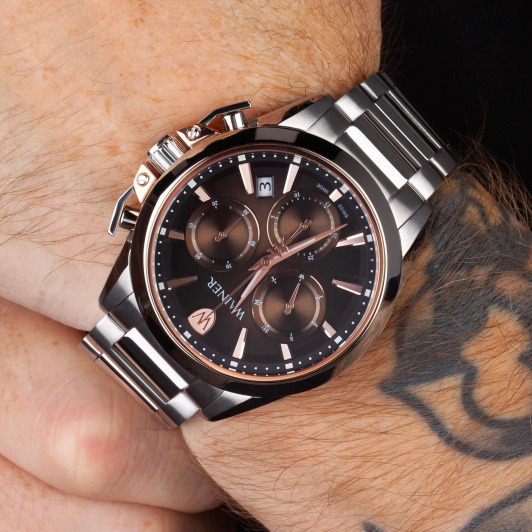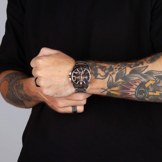 Корпус: Корпус часов выполнен из нержавеющей стали 316 L с частичным PVD покрытием. Циферблат коричневого цвета выполнен по технологии Sunray (солнечные лучи) и защищен прочным сапфировым стеклом. Метки в виде штрихов. Клиновидные стрелки с люминесцентным покрытием, которое светится в темноте после непродолжительной зарядки на свету. Рифленая заводная головка с защитой. Завинчивающаяся задняя крышка. Диаметр корпуса 44 мм. Водонепроницаемость 100 метров.