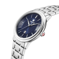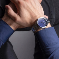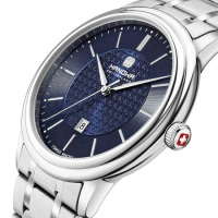 Корпус: Корпус выполнен из нержавеющей стали. Синий циферблат c серебристыми полированными часовыми индексами и стрелками. Минеральное стекло защищает часы от повреждений. Диаметр: 44 мм. Водостойкость: 50 м.