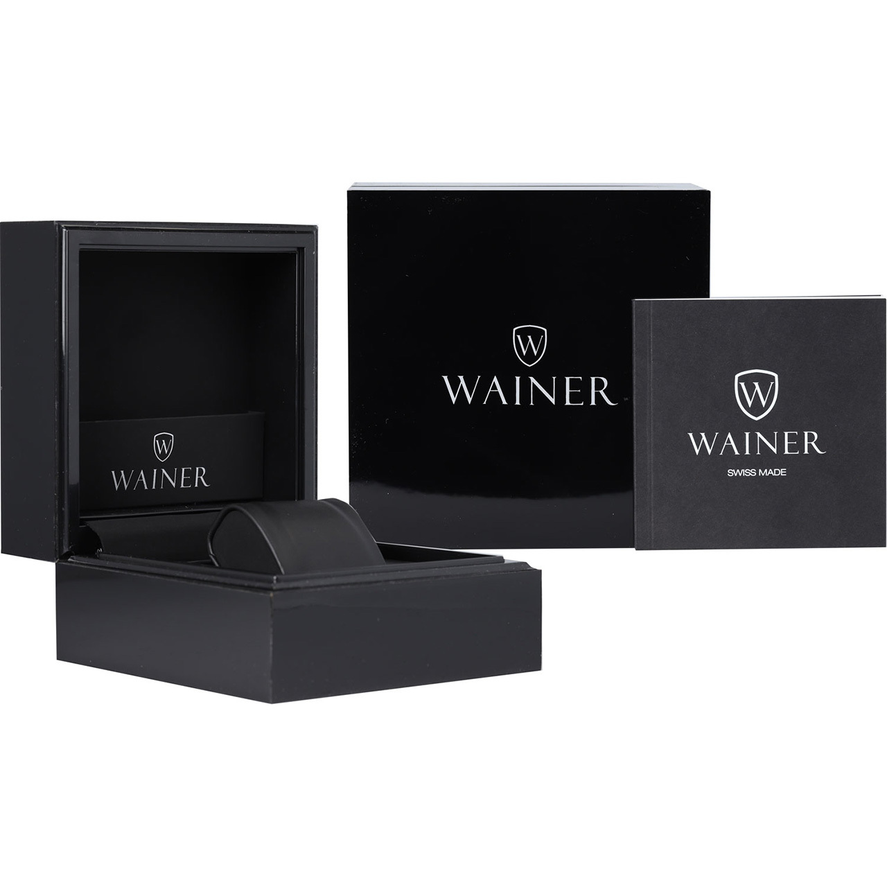 Корпус: Прямоугольный корпус из нержавеющей стали 316L с PVD покрытием цвета розового золота. Циферблат чёрного цвета, защищен устойчивым к царапинам сапфировым стеклом, украшен кристаллом и фирменным логотипом Wainer в положении 12 часов. Рифленая заводная головка с защитой. Размер корпуса 22х24,5 мм, . Водонепроницаемость 30 метров.
