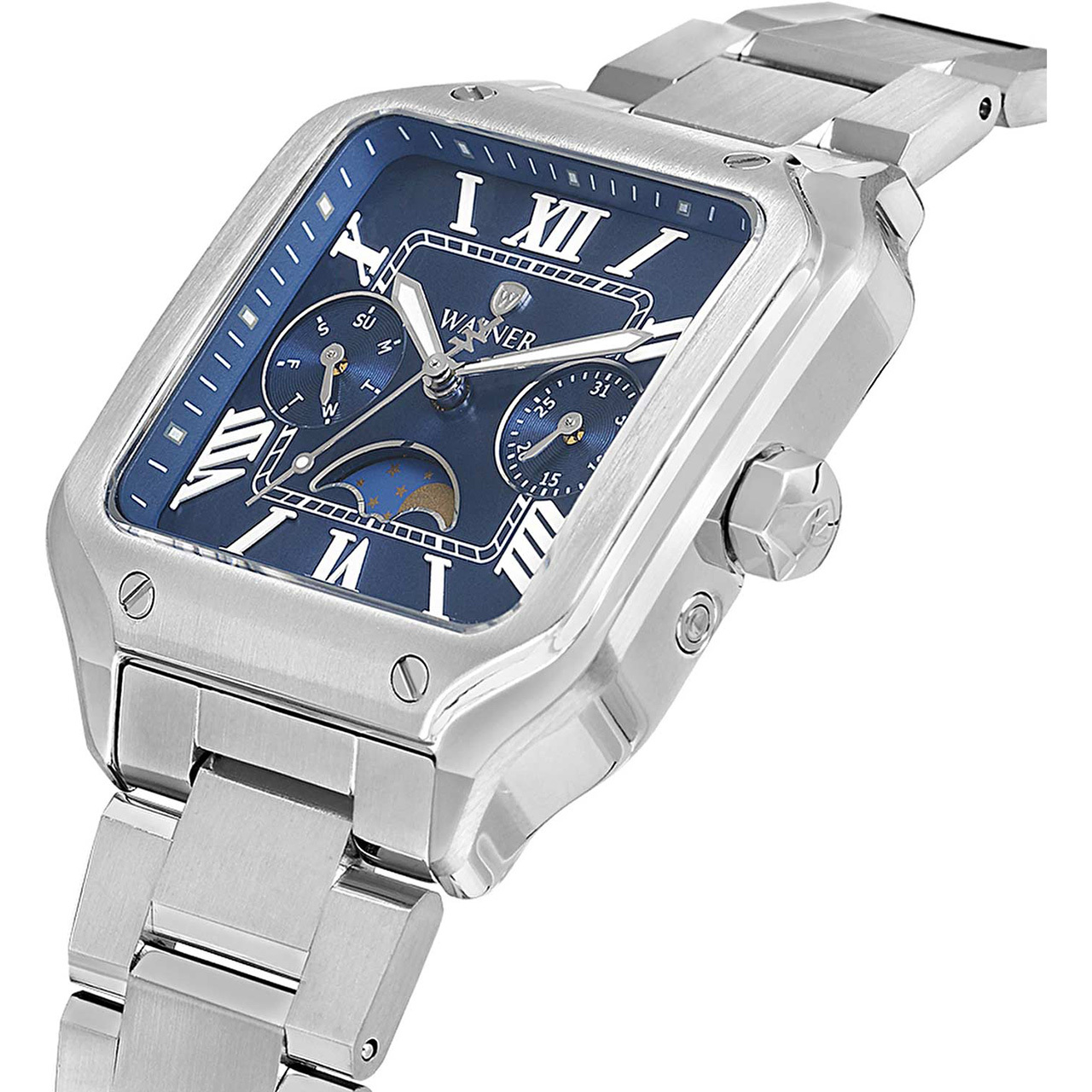 Корпус: Квадратный корпус из нержавеющей стали 316L. Циферблат синего цвета. Метки в виде штрихов и римских цифр. Секундная стрелка на конце декорирована буквой W. Сапфировое стекло устойчивое к появлению царапин. Граненая заводная головка с защитой украшена фирменным логотипом. Размер корпуса 32х32 мм, . Водонепроницаемость 30 метров.
