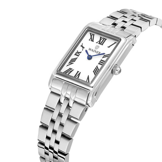 Корпус: Прямоугольный корпус из нержавеющей стали 316L. Циферблат белого цвета, защищен устойчивым к царапинам сапфировым стеклом, украшен фирменным логотипом Wainer в положении 12 часов. Рифленая заводная головка. Размер корпуса 20,8х32 мм, . Водонепроницаемость 30 метров.