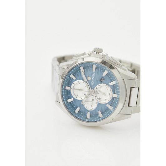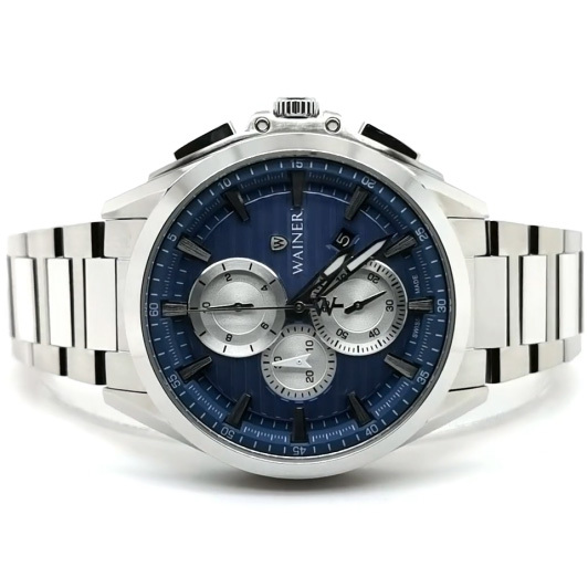 Корпус: Круглый корпус из нержавеющей стали 316L с матовой и полированной отделкой. Синий циферблат украшен декоративным узором в виде горизонтальных линий и фирменным логотипом Wainer. Циферблат защищен прочным сапфировым стеклом. Накладные метки в виде штрихов. Люминесцентные стрелки. Рифленая заводная головка с защитой. Диаметр корпуса 43 мм. Водонепроницаемость 50 метров.