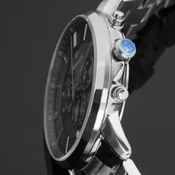 Функции: Центральные часовая и минутная стрелки, маленький секундный индикатор на «3 часах». Апертура даты находится в положении между 4 и 5 часами. Хронограф с центральной секундной стрелкой.