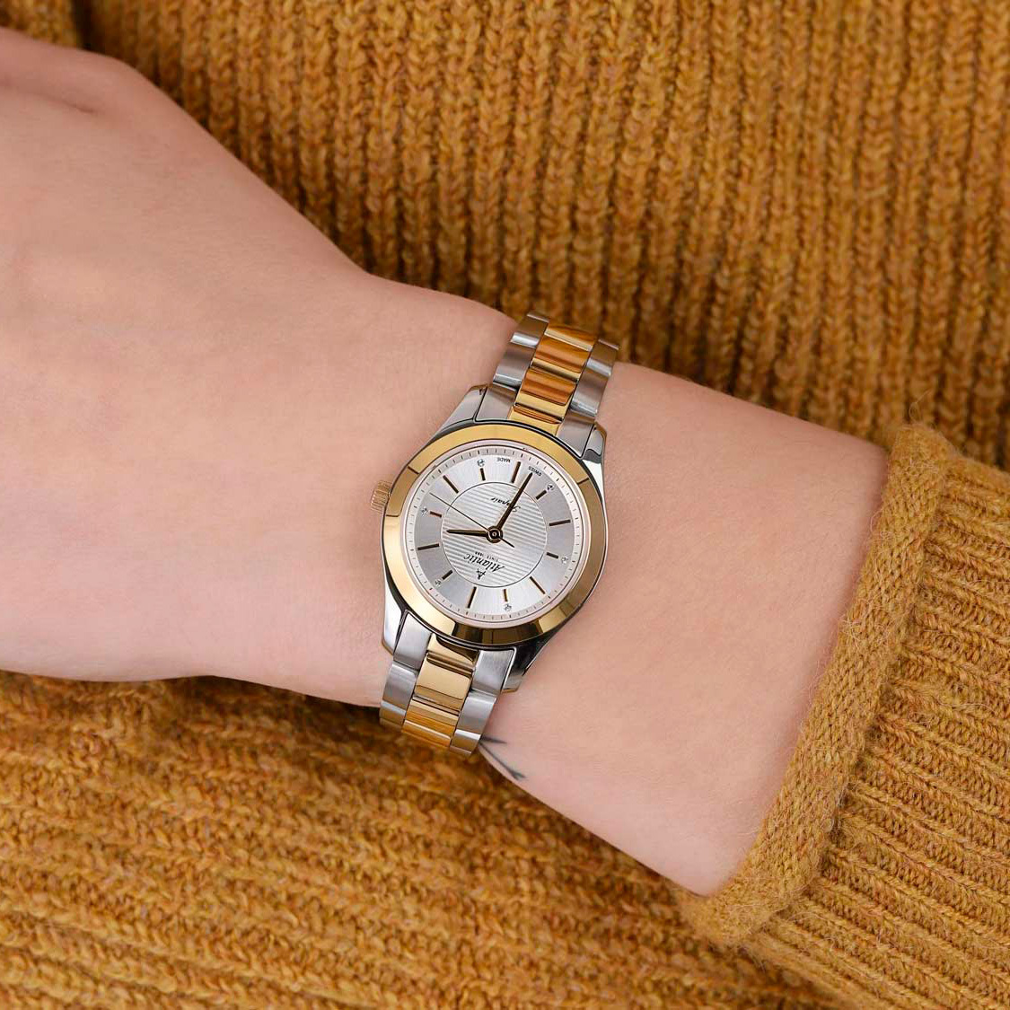 Корпус: Корпус выполнен из высококачественной стали с повышенной устойчивостью к коррозии с частичным PVD покрытием. Металлик циферблат в центральной части с гильошированным узором, украшенный кристаллами. Позолоченные полированные стрелки и часовые индексы. Сапфировое стекло устойчивое к появлению царапин, обладающее высокой прозрачностью. Диаметр: 28,5 мм. Водозащита: 30 м.