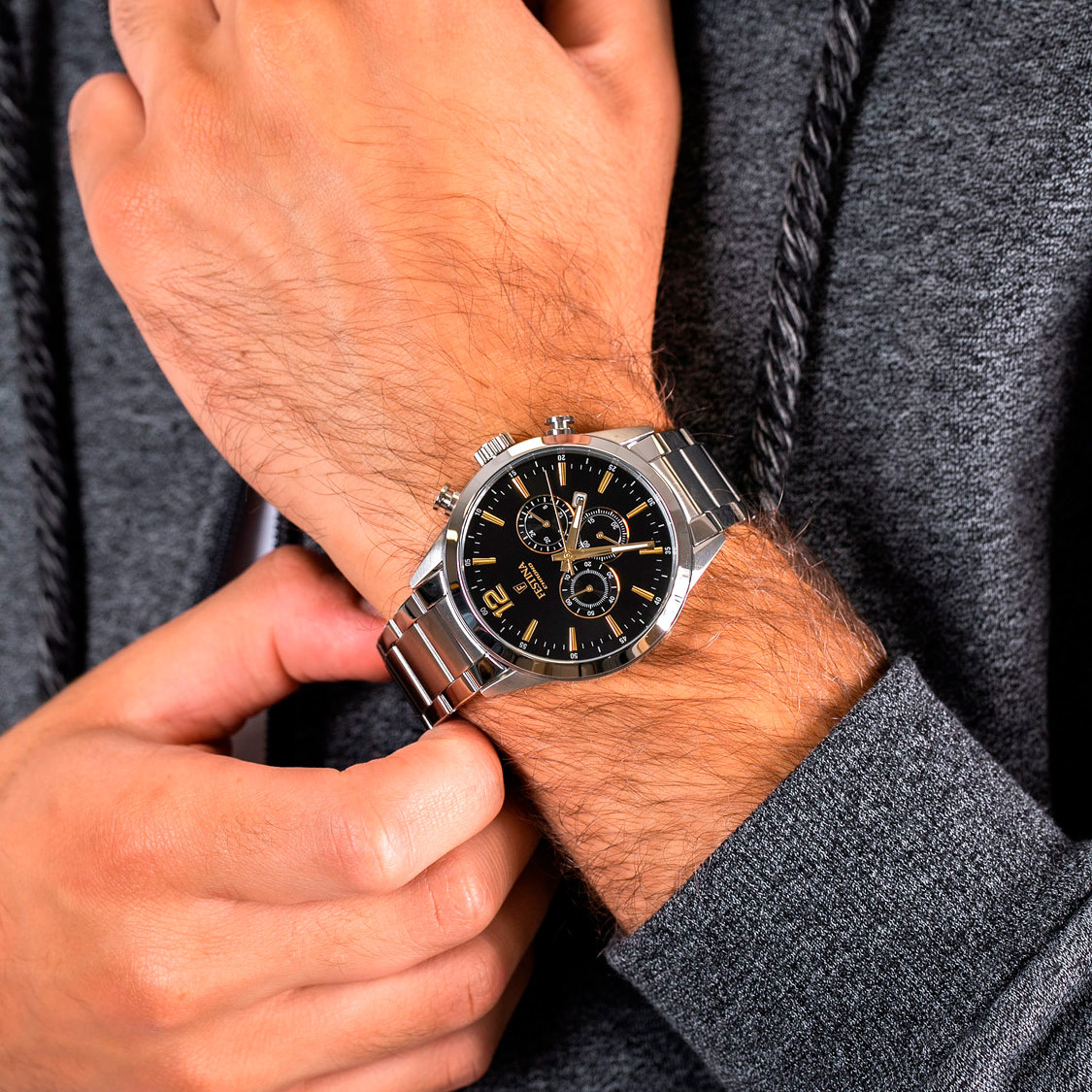 Функции: Индикация часов и минут при помощи центральных стрелок. 12-ти и 24-х часовой формат времени. Хронограф. Окошко даты находится в положении между 4 и 5 часов.