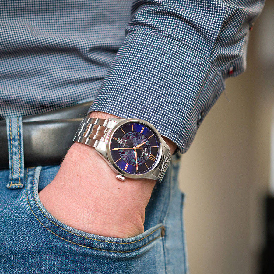 Корпус: Круглый стальной корпус c сатинированной поверхностью. Синий циферблат украшен гильоше с метками в виде штрихов и 12-ти часовая метка в виде римской цифры. Стрелки с люминесцентным покрытием. Минеральное стекло. Рифленая заводная головка с защитой. Габаритные размеры: D 43мм, толщина 10,35мм. Водонепроницаемость: 50 м.