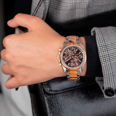 Корпус: Ударопрочный корпус часов сделан из нержавеющей стали с частичным розовым PVD покрытием. Коричневыйвый циферблат с золотистыми стрелками и часовыми индексами. Корпус и циферблат украшены кристаллами. Минеральное стекло. Рифленая заводная головка. Диаметр: 38 мм. Водонепроницаемость: 100 м.
