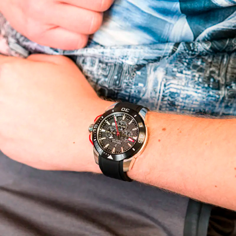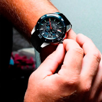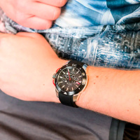Корпус: Ударопрочный корпус часов сделан из нержавеющей стали. Неподвижный безель из нержавеющей стали с PVD-покрытием чёрного цвета. Чёрный циферблат со стрелками и часовыми индексами в виде штрихов с нанесенным люминесцентным покрытием, которое светится в темноте после непродолжительной зарядки на свету. Минеральное стекло устойчивое к возникновению царапин. Рифленая заводная головка с защитой. Диаметр: 47 мм. Водонепроницаемость: 100 м.