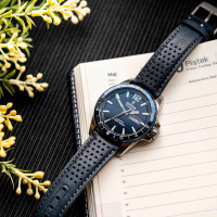 Корпус: Круглый титановый корпус с частичным PVD покрытием. Безель с часовыми метками. Циферблат выполнен по технологии Sunray (солнечные лучи). Метки в виде штрихов и арабской цифры 12. Минеральное стекло более устойчиво к появлению небольших царапин и потертостей, хорошо может выдержать небольшие удары и падения. Стрелки с люминесцентным покрытием. Рифленая заводная головка с защитой. Завинчивающаяся задняя крышка. Диаметр 43 мм. Водонепроницаемость 100 м.