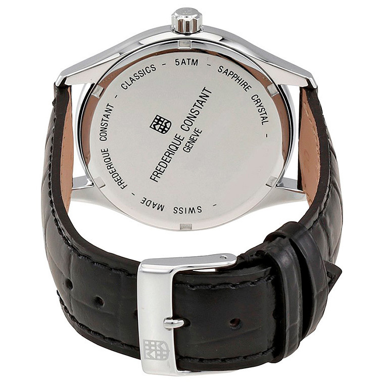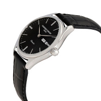 Корпус: Корпус из нержавеющей полированной стали. Чёрный циферблат с серебристыми стрелками и рисками. Декор в технике гильоше. Сапфировое стекло. Диаметр 40 мм. Водозащита 50 м.