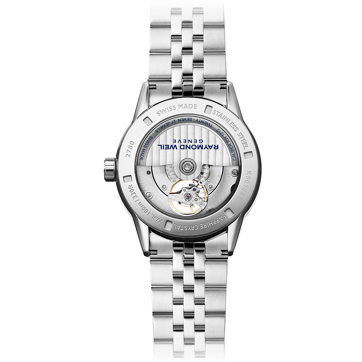 Ремешок: Браслет из высококачественной стали с 5 рядами литых звеньев. Браслетная застежка, раскладывающаяся при нажатии на кнопки с двойной системой блокировки, украшена гравировкой Raymond Weil.