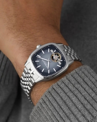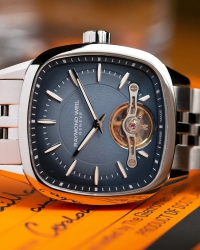 Корпус: Корпус квадратной формы выполнен из нержавеющей стали марки 316L с матовой шлифовкой и глянцевой полировкой.Градиентный циферблат синего цвета с открытым балансом хода. Люминесцентное покрытие Super-Luminova®, светящееся в темноте, нанесено на стрелки и разметку циферблата. Сапфировое стекло имеет повышенную устойчивость к возникновению царапин. Антибликовое покрытие нанесенное с обеих сторон стекла. Задняя крышка с прозрачным окном из сапфирового стекла имеет резьбовое соединение с корпусом. Завинчивающаяся заводная коронка с монограммой RW. Размер корпуса 40х40мм, толщина 10,5мм. Водостойкость на глубине до 100 метров (10 бар/АТМ).