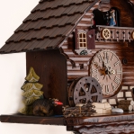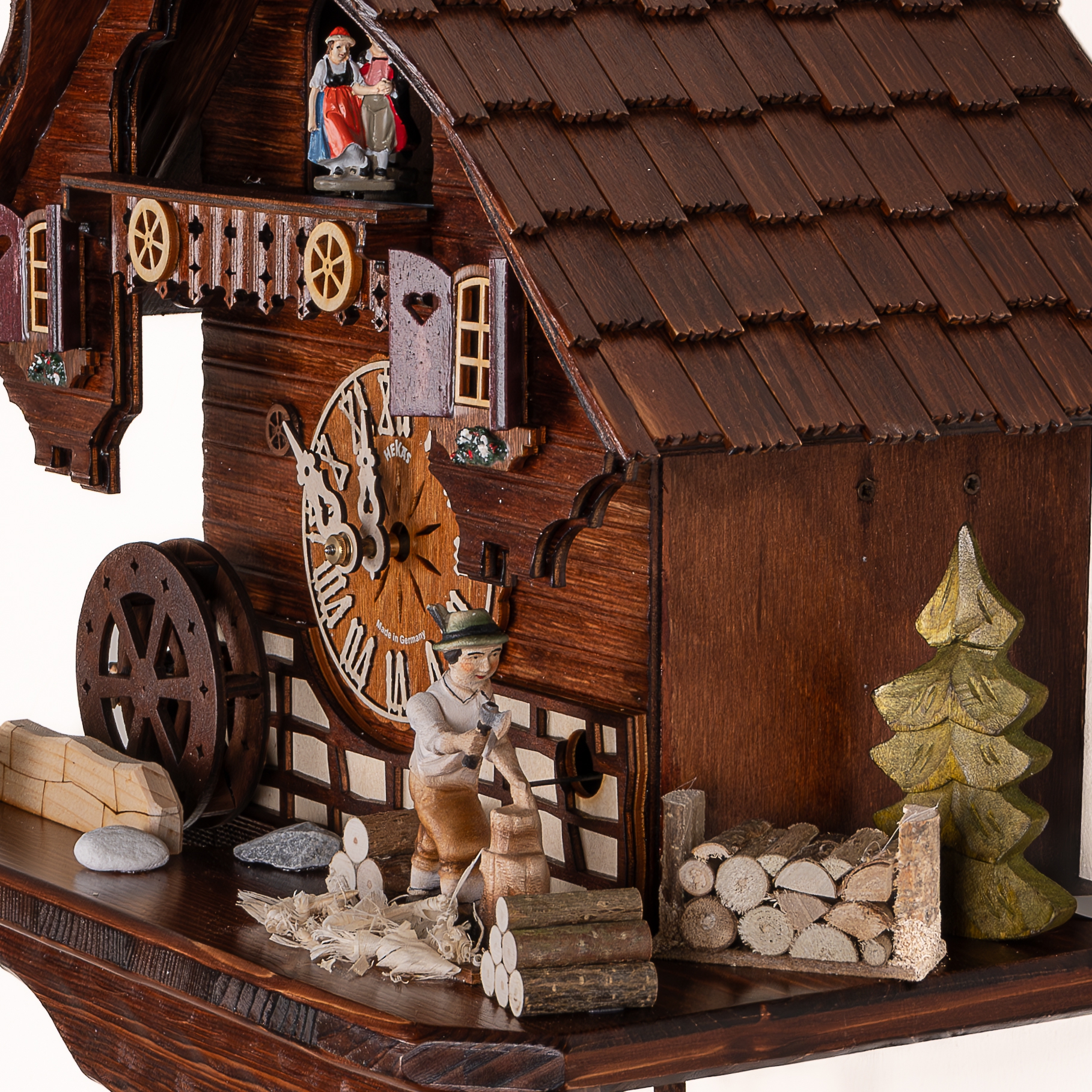 Материал: Натуральное дерево. Дом в стиле Шале. Декоративная резьба. Деревянная черепица. Деревянный циферблат часов. Деревянная кукушка. Движущиеся элементы-танцоры, лесоруб и мельничное колесо.