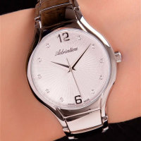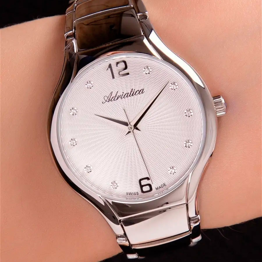 Корпус: Круглый корпус выполнен из полированной нержавеющей стали. Серебристый циферблат с узором гильоше, украшен 10 кристаллами. Накладные часовые индексы выполнены из стали. Минеральное стекло. Диаметр корпуса составляет 33 мм, толщина 7 мм. Водостойкость WR 30 (мытье рук, дождь).