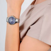 Корпус: Круглый корпус выполнен из полированной нержавеющей стали. Циферблат синего цвета украшен 10 цирконами. Сапфировое стекло, устойчивое к царапинам. Диаметр корпуса составляет 33 мм, толщина 7 мм. Водостойкость WR 30 (мытье рук, дождь).