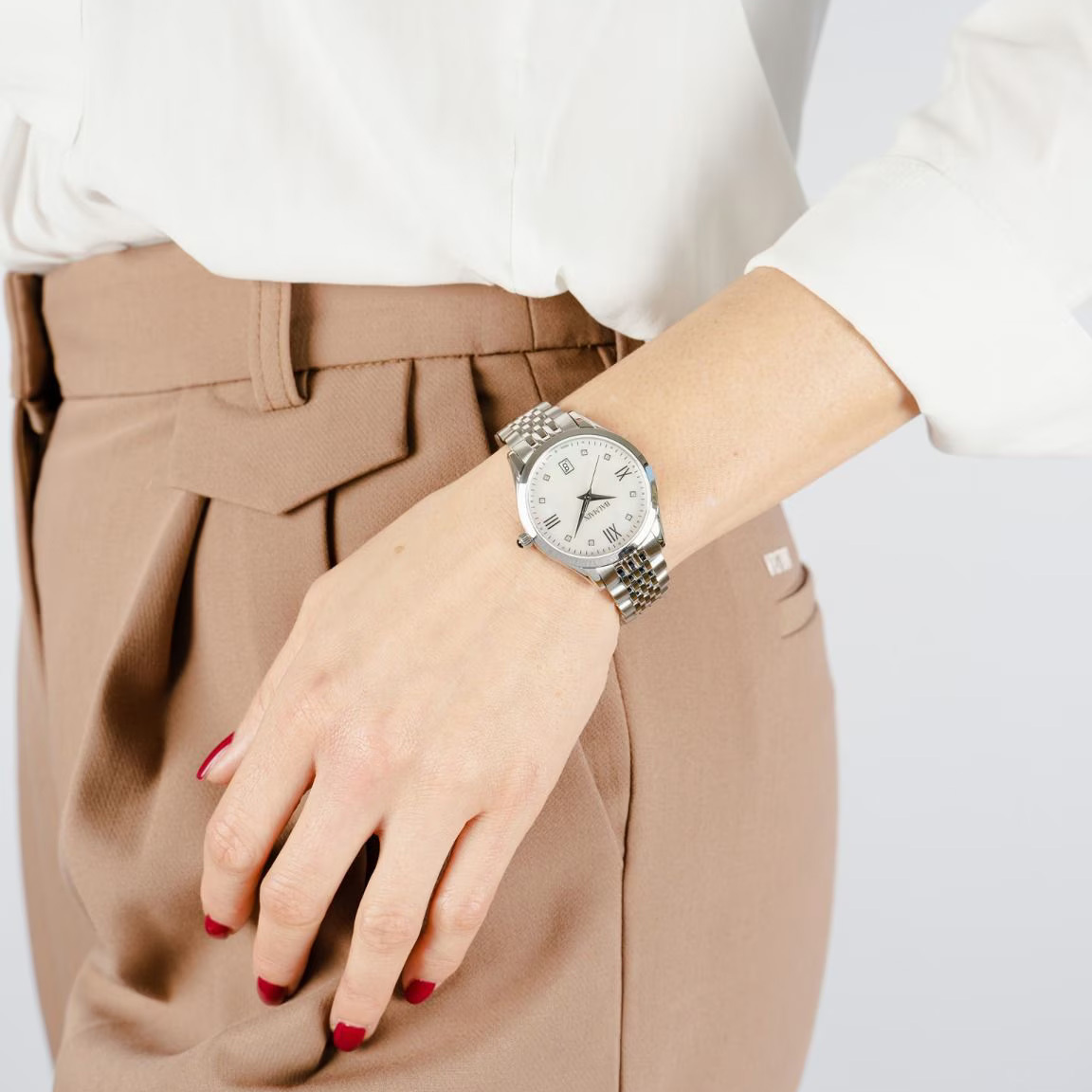 Корпус: Корпус выполнен из нержавеющей стали 316L, которая чрезвычайно прочна и устойчива к коррозии, поверхность с полировкой до зеркального блеска. Циферблат белый перламутровый украшен 8 бриллиантами. Часовые индексы и стрелки выполнены из стали. Сапфировое стекло, устойчивое к появлению царапин, обладающее высокой прозрачностью. Диаметр: 30 мм. Водостойкость: 50 м.