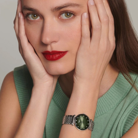 Корпус: Корпус выполнен из высококачественной стали 316L с повышенной устойчивостью к коррозии, поверхность с полировкой до зеркального блеска. Циферблат зелёного цвета выполнен по технологии Sunray (солнечные лучи), украшен 12 бриллиантами группы Top Wesselton VS-SI общим весом 0,081 карата. Сапфировое стекло с антибликовым покрытием защищает циферблат от царапин и обеспечивает отличную читаемость при любом освещении. Диаметр корпуса: 29мм, вес 55,5г. Водостойкость: 30 метров.