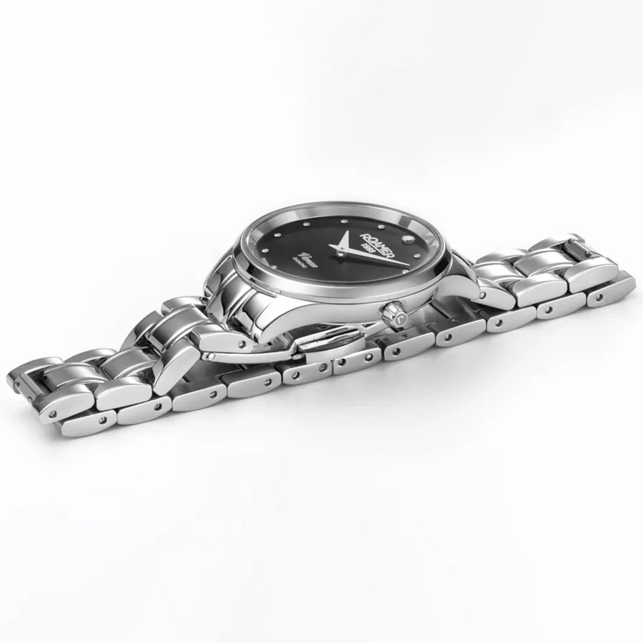 Корпус: Корпус изготовлен из высококачественной нержавеющей стали, марки 316L. Чёрный перламутровый циферблат. Накладные точечные часовые индексы и стрелки выполнены из полированной стали. На каждом циферблате в положении «12 часов» расположен уникальный бриллиант. Сапфировое стекло с антибликовым покрытием защищает циферблат от царапин и обеспечивает отличную читаемость при любом освещении. Рифлёная заводная головка. Диаметр: 30 мм. Водонепроницаемость: 50 метров.