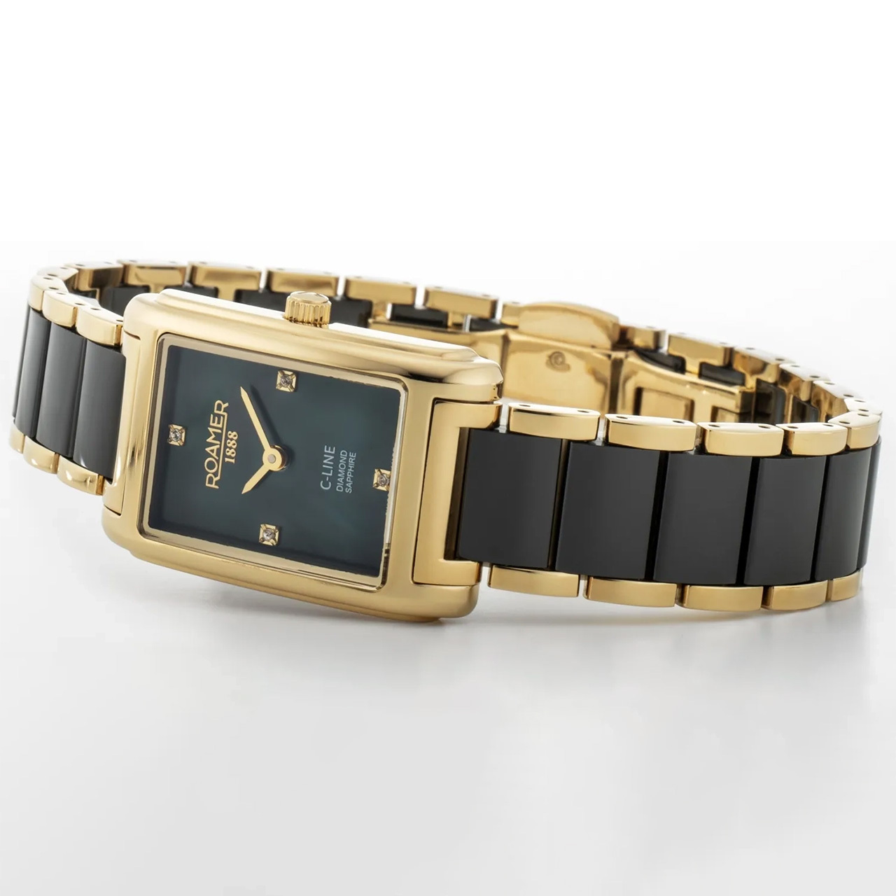 Корпус: Корпус изготовлен из высококачественной нержавеющей стали, марки 316L с частичным PVD - покрытием жёлтого золота. Черный перламутровый циферблат. Накладные точечные часовые индексы и стрелки выполнены из полированной стали с позолотой. На каждом циферблате в положении «12 часов» расположен уникальный бриллиант. Сапфировое стекло с антибликовым покрытием защищает циферблат от царапин и обеспечивает отличную читаемость при любом освещении. Рифлёная заводная головка. Размер корпуса: 21 x 32 мм. Водонепроницаемость: 30 метров.
