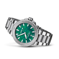 Коллекция: Bracenet Aquis Automatic. Новое сотрудничество Oris с Bracenet поддерживает миссию экологического предприятия по защите морей. Эти часы Aquis с калейдоскопическим зеленым циферблатом, выполненным из переработанных рыболовных сетей. Каждый циферблат уникален благодаря случайному процессу. В результате получился циферблат, вдохновлённый океаном, - ежедневное напоминание о вашем вкладе в сохранение океана.
