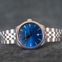 Корпус: Круглый корпус выполнен из нержавеющей стали 316L, поверхность с матовой шлифовкой – сатинированием и полировкой до алмазного блеска. Синий циферблат с эффектом солнечных лучей (Sunray). Накладные часовые индексы и клиновидные стрелки в стиле Dauphine выполнены из стали с родиевым покрытием. Сапфировое стекло с антибликовым покрытием устойчиво к царапинам сохраняет прозрачность на протяжении многих лет. Заводная головка украшена фирменным логотипом. Диаметр корпуса составляет: 39 мм., толщина - 9 мм. Класс водозащиты: 10 бар (100 метров), позволит плавать.