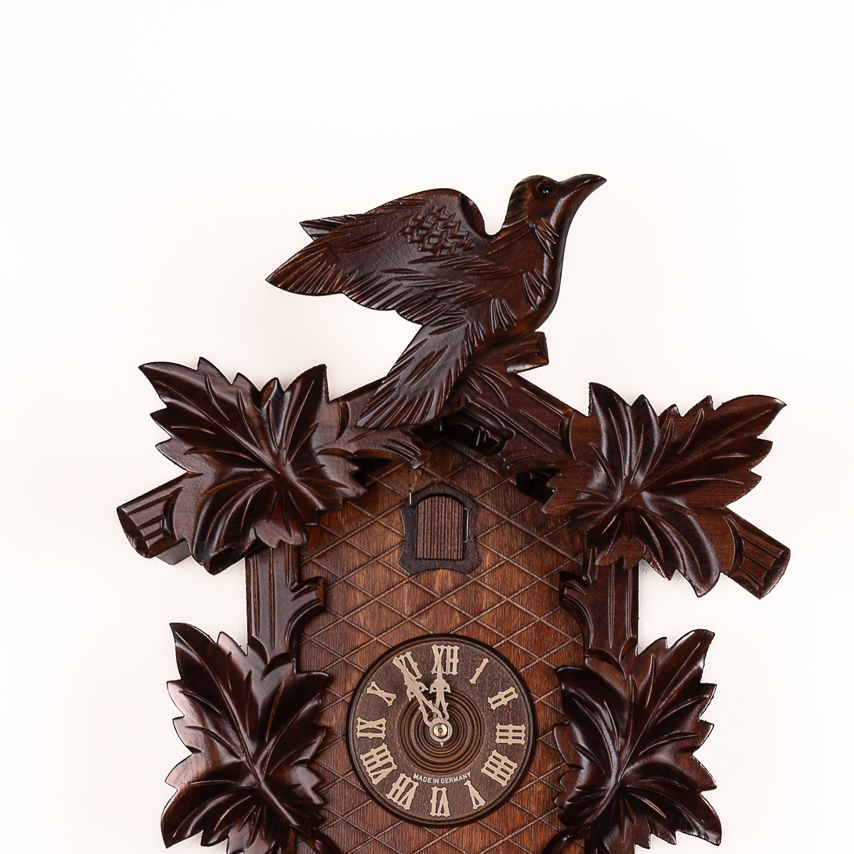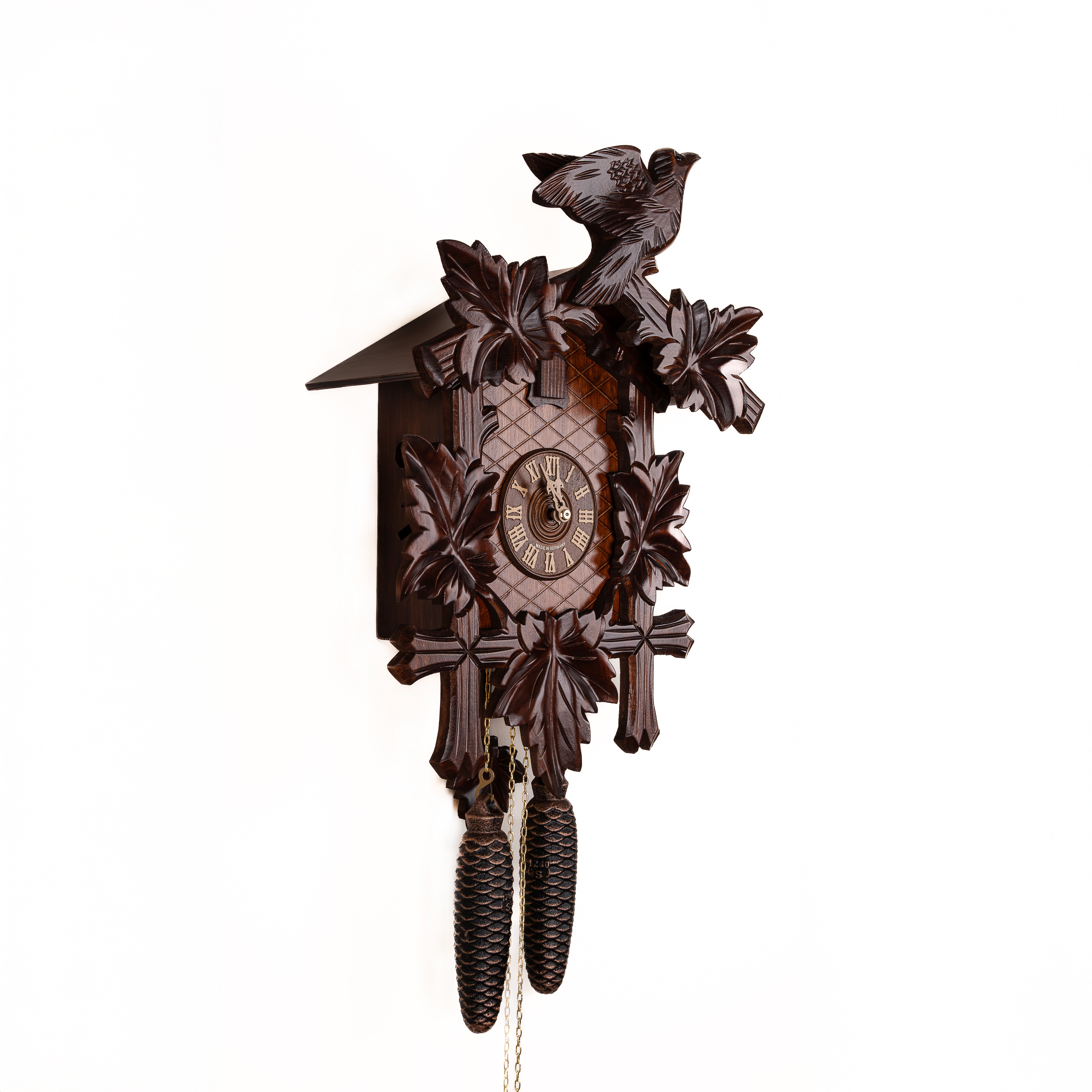 Механизм: Механические часы с кукушкой, которые работают от гирь на цепной тяге. Сделан на фирме SBS-Feintechnik GmbH & Co. KG Германия. Запас хода на 8 дней. Ручное отключение звука. В каждые пол часа кукушка появляется из своего домика, наклоняется и воспроизводит звук кукушки (ку-ку) один раз, в каждый полный час она кукует столько раз сколько показывают стрелки на часах. Одна гиря в данных часах отвечает за ход часового механизма, а вторая за механизм кукушки.