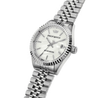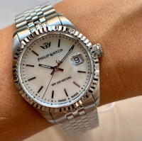 Корпус: Корпус выполнен из высококачественной стали с повышенной устойчивостью к коррозии, поверхности с матовой шлифовкой – сатинированием и полировкой до зеркального блеска. Белый циферблат из натурального перламутра. Люминесцентный состав на стрелках. Сапфировое стекло, это лучшее стекло для наручных часов, которое не царапается при механическом воздействии, его можно повредить только алмазом. Диаметр корпуса: 35 мм. Водозащита до 100 метров позволит плавать.