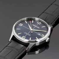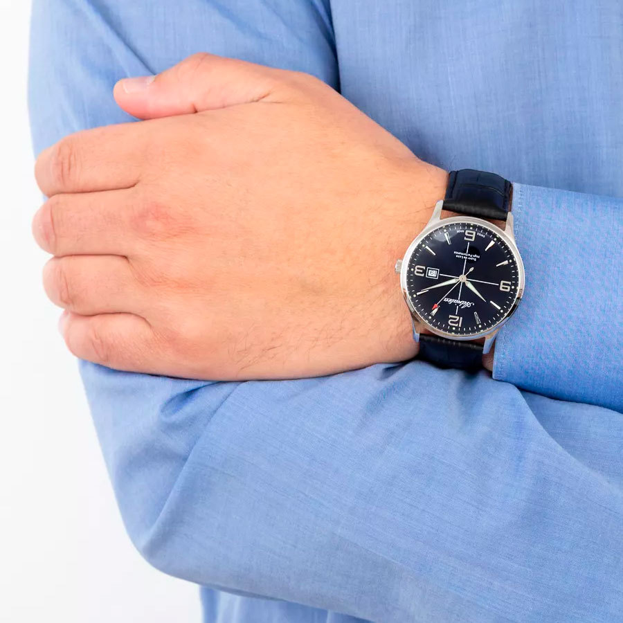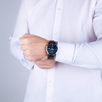 Корпус: Круглый корпус выполнен из полированной нержавеющей стали. Синий циферблат. Накладные часовые индексы выполнены из стали. Стрелки с покрытием SuperLuminova, которое обеспечивает подсветку в темное время суток. Минеральное стекло. Диаметр корпуса составляет 42 мм, толщина 10 мм. Водостойкость WR 50 (мытье рук, дождь).