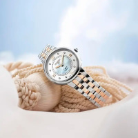 Корпус: Нержавеющая сталь. Белый циферблат декорирован натуральным перламутром и бриллиантами на часовых метках. Золотистые стрелки и римские цифры. Сапфировое стекло с антибликовым покрытием. Водонепроницаемость 50 метров. Диаметр 30 мм.