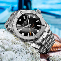Корпус: Нержавеющая сталь, вращающийся безель. Черный циферблат с волнистой текстурой . Серебристые стрелки и часовые индексы с люминесцентным покрытием. Сапфировое стекло с антибликовым покрытием. Водонепроницаемость: 200 метров. Диаметр: 43 мм.