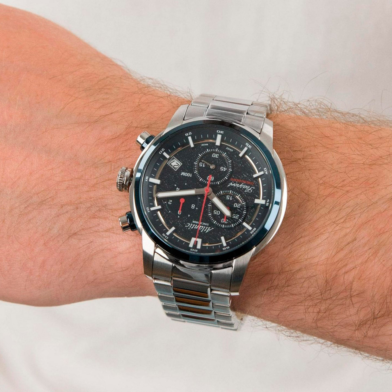 Функции: Центральные часовая и минутная стрелки, маленькая секундная стрелка на «6 часов». Окошко даты. Хронограф с 30-минутным и 1/10-секундным индикаторами на «9» и «3 часах» соответственно. Центральная секундная стрелка хронографа.