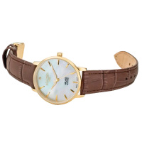 Корпус: Корпус выполнен из высококачественной нержавеющей стали 316L, с IP покрытием. Перламутровый циферблат белого цвета декорирован 1 бриллиантом, золотистые стрелки и часовые индексы. Стрелки с люминесцентным покрытием для оптимальной разборчивости в условиях низкой освещенности. Сапфировое стекло с антибликовым покрытием. Диаметр: 32 мм. Водозащита: 50 м.