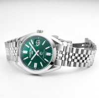 Корпус: Корпус модели выполнен из высококачественной стали с повышенной устойчивостью к коррозии, поверхности с матовой шлифовкой – сатинированием и полировкой до зеркального блеска. Циферблат зеленого цвета, выполнен по технологии Sunray (солнечные лучи). Стальные стрелки и часовые индексы в виде штрихов с люминесцентным покрытием Super-LumiNova для оптимальной разборчивости в условиях низкой освещенности. Сапфировое стекло с антибликовым покрытием. Рифленая заводная головка. Диаметр: 41 мм. Водонепроницаемость: 100 м.