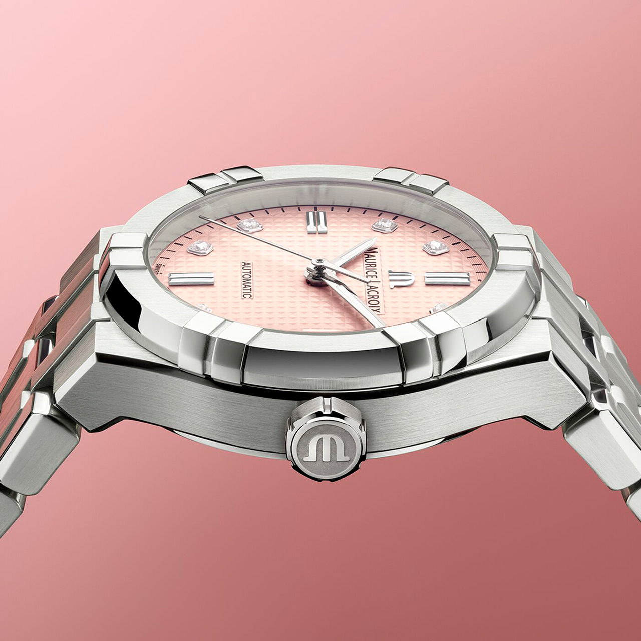 Ремешок: Модель с браслетом из нержавеющей стали с литыми звеньями в пять рядов, система быстрой замены ремешка/браслета, браслетная застежка с тройным сложением – «бабочка», раскладывающаяся при нажатии кнопок двойной блокировки, гравировка Maurice Lacroix. Часы в комплекте с розовым ремешком из натурального каучука с тиснением, классическая застежка пряжка.