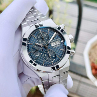 Функции: Индикация часов, минут при помощи центральных стрелок. Малая секундная стрелка в положении «9 часов». Центральная секундная стрелка для отображения показаний хронографа. 30-минутный счетчик хронографа в положении «12 часов». 12-часовой счетчик хронографа в положении «6 часов». Индикация дня недели и даты в положении «3 часа».