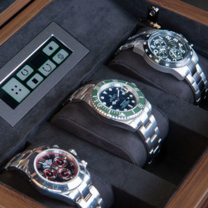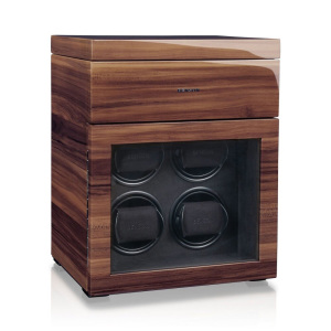 Механизм: Шкатулка с приводом (watch winders) прямоугольной формы, для хранения и поддержания в рабочем состоянии наручных часов с автоподзаводом в количестве 4 штук. Шкатулка оснащена мощным двигателем с бесшумным ходом и достаточно длительным сроком эксплуатации. Завод механизма часов осуществляет двигатель, совершающий поочерёдное вращение по часовой стрелке, против часовой стрелки и вращение в двух направлениях со скоростью 600; 900; 1200; 1500; 1800; 2100 оборотов в день. На жидкокристаллическом дисплее, созданном по эксклюзивной технологии, отражена функция контроля работы двигателя. Энергия для двигателя и жидкокристаллического дисплея поступает от сети переменного тока через входящий в комплект адаптер.