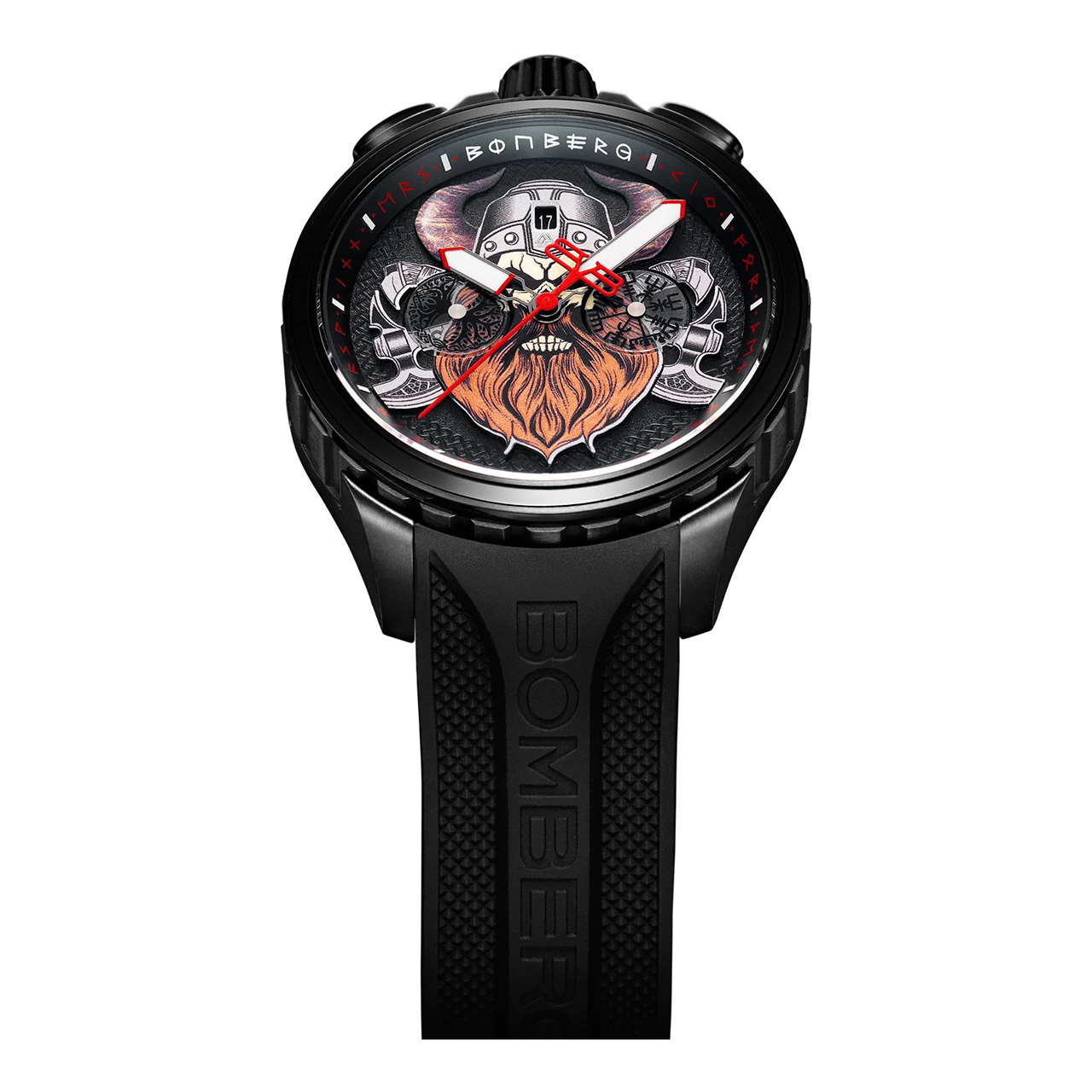 Корпус: Круглый корпус выполнен из нержавеющей стали. Стойкое к царапинам DLC покрытие черного цвета. Циферблат декорирован изображением викинга (свирепый и отважный мужчина пришедший из Скандинавии) и эмблемами и значками из скандинавской мифологии. Циферблаты хронографа выполнены в виде важнейших символов викингов Иггдрасиль (древо жизни) и Вегвисир (северный компас). Борода викинга украшена люминесцентным составом. Мечевидные стрелки с люминесцентным покрытием. Сапфировое стекло с антибликовым покрытием. Диаметр корпуса 45 мм, толщина - 13 мм. Водостойкость 50 метров.