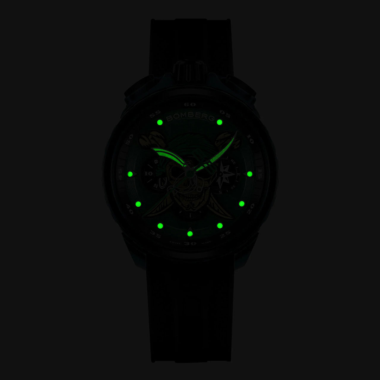 Корпус: Круглый стальной корпус марки 316L, с PVD покрытием синего цвета. Зелёный циферблат, часовые индексы и стрелки из белой латуни с люминесцентным покрытием (Super-LumiNova). На циферблате изображен уникальный рельефный череп. Сапфировое стекло с антибликовым покрытием.
