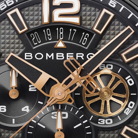 Корпус: Круглый корпус выполнен из нержавеющей стали. Стойкое к царапинам DLC покрытие черного цвета и PVD-покрытие золотом. Черный алюминиевый безель. Черный циферблат «clou de Paris» придает модели текстуру и элегантность. Уникальный дизай с завинчивающейся заводной головкой в положении «12 часов» и кнопками хронографа. Аппликация часовых индексов и стрелки с покрытием Super-Luminova®. Сапфировое стекло с антибликовым покрытием. Диаметр корпуса 45 мм, толщина - 13 мм. Водостойкость 50 метров.