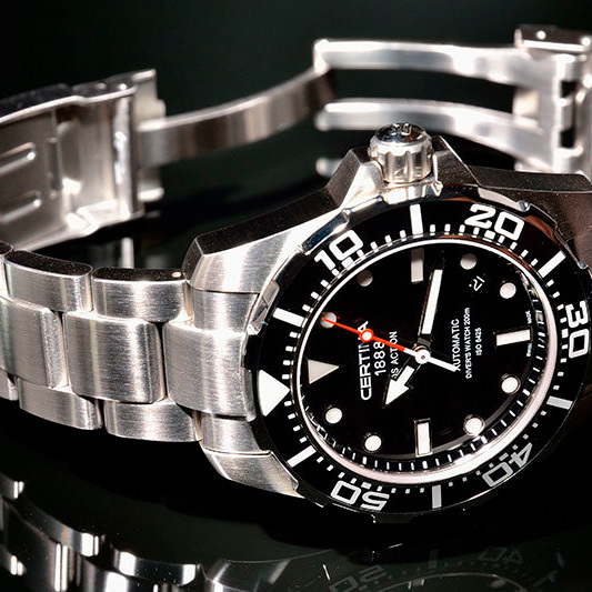 Корпус: Корпус из нержавеющей полированной/матовой стали. Вращающийся в одном направлении безель с 60 - минутной шкалой на полированном чёрном кольце. Чёрный циферблат. Стрелки и часовые индексы серебристого цвета с люминесцентным покрытием. Завинчивающаяся заводная коронка. Сапфировое стекло с антибликовым покрытием. Диаметр 43.2 мм. Водостойкость 200 м. Система DS.