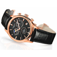 Функции: Индикация часов, минут при помощи центральных стрелок. Хронограф с 12-ти часовым, 60-ти секундным и 30-ти минутным счетчиками, индикация фазы луны и лунного цикла, индикация даты на "4" часа, вынесенная секундная стрелка на "6" часов.