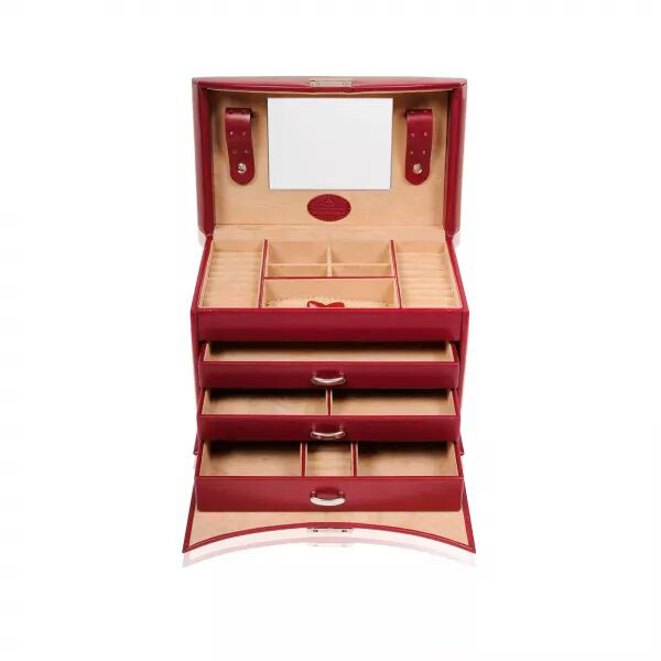 Описание: Шкатулка "Merino 17" для украшений с открывающимися отделениями. Корпус обтянут экокожей цвета бордо. Шкатулка с выдвижными ящиками с отделениями разной величины. Верхний ярус оснащен валиками для колец, мелкими ячейками, а также дополнительным отделением с крышечкой. В одном из нижних ярусов – отдел для колье. На внутренней стороне крышки – ремешки с отверстиями для сережек и зеркало. Надежный патентованный замок. Удобная ручка для переноски. Внутри шкатулка отделана мягким бархатистым велюром бежевого цвета.